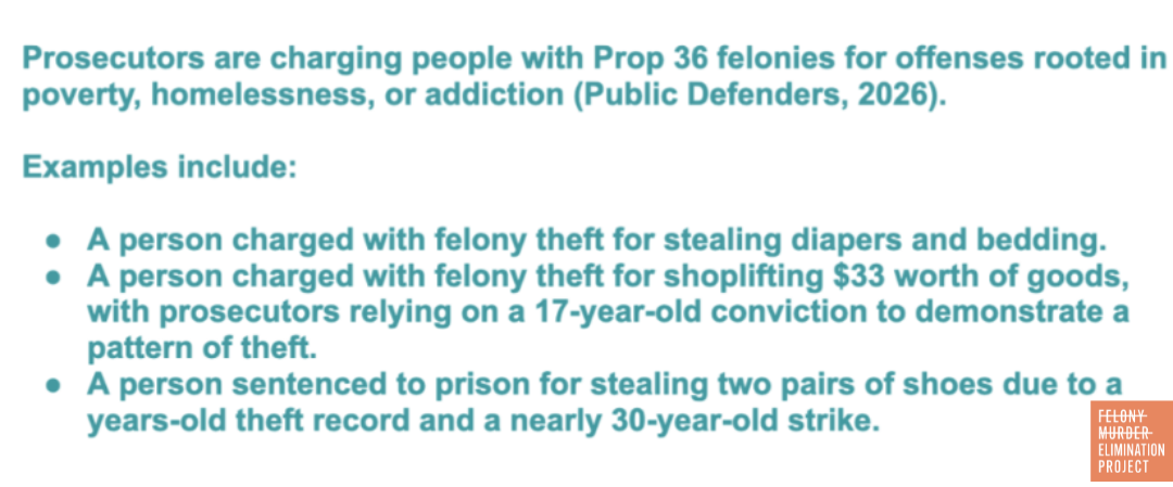 - Communities of color bear the brunt. Black Californians are dramatically overrepresented in Proposition 36 charges. In Contra Costa County, for example, Black residents account for more than half of all Proposition 36 theft charges despite making up less than one-tenth of the population.