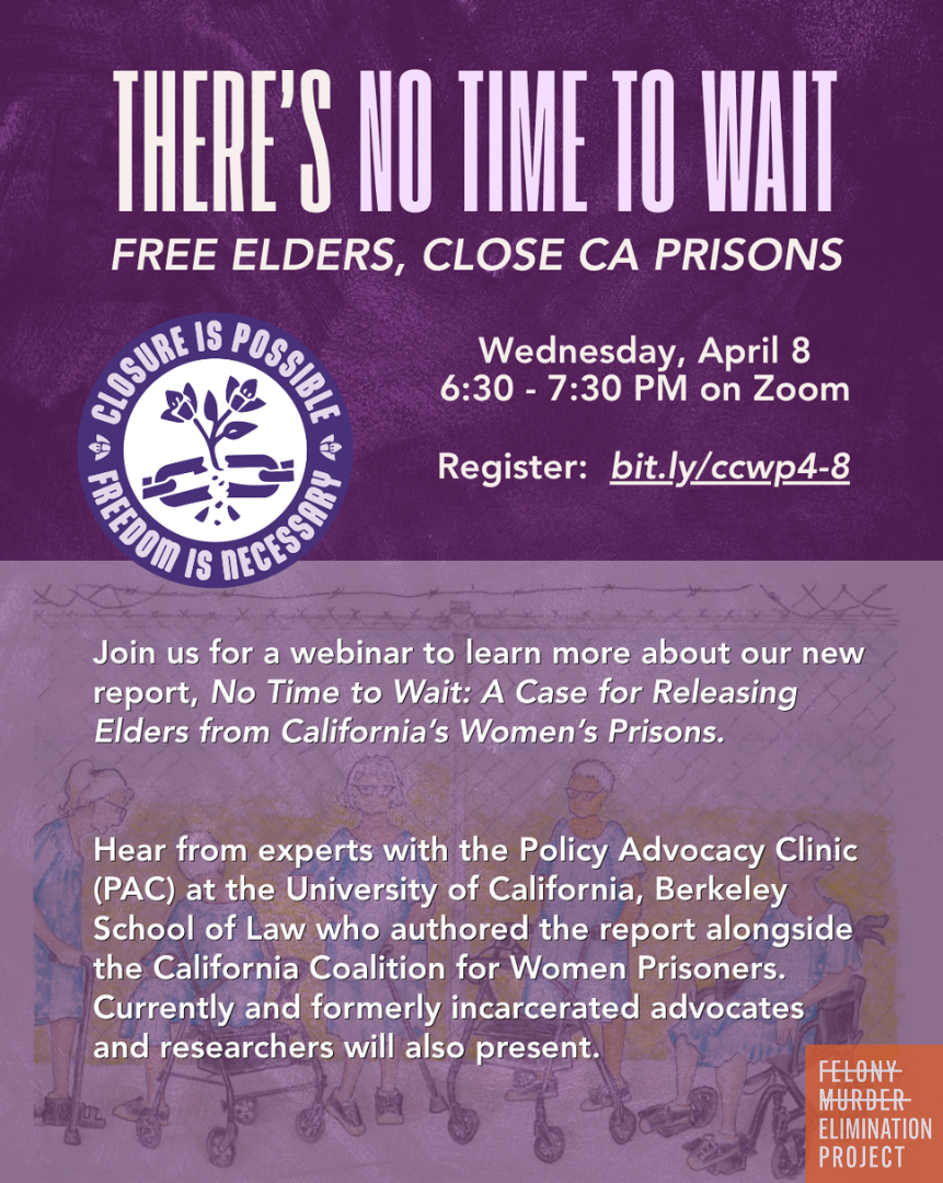 Felony Murder Elimination Project would like to extend an invitation to our supporters to register for a webinar, “No Time to Wait: A Case for Releasing Elders from California’s Women’s Prisons,” an in-depth discussion about a report of the same name released last month.